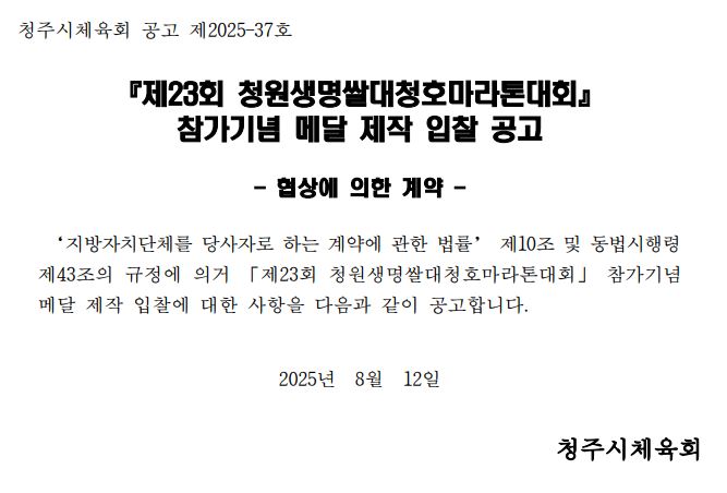 | 제23회 청원생명쌀대청호마라톤대회 참가기념 메달 제작 입찰 공고 | |